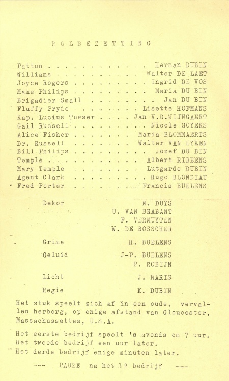 Acteurs: Herman Du Bin, Walter De Laet, Ingrid De Vos, Maria Du Bin, Jan Du Bin, Lisette Hofmans, Jan Van den Wijngaert, Nicole Goyers, Maria Blommaerts, Walter Van Eyken, Jozef Du Bin, Albert Ribbens, Lutgarde Du Bin, Hugo Blondiau en Francis Buelens